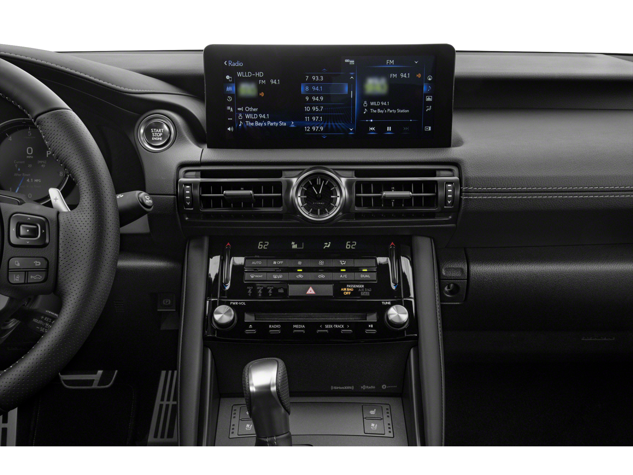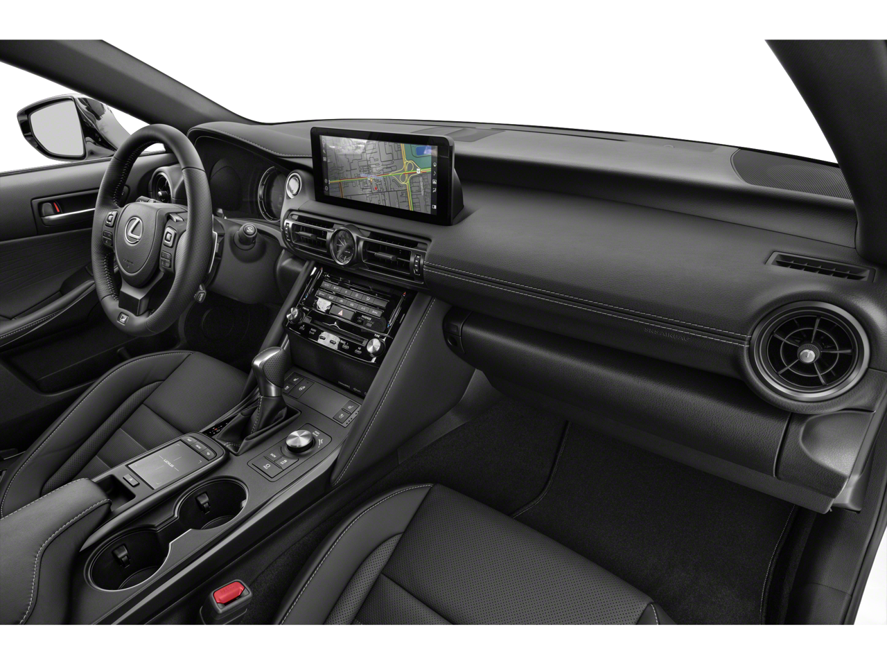 Accessory Package (Cargo Net, Carpet Trunk Mat, and Key Gloves), Memory Package (Lexus Memory System for Driver's Seat, Outside Mirrors w/Auto Tilt-Down in Reverse, and Power Tilt & Telescoping Steering Wheel), Navigation Package, Lexus Certified, Black Nuluxe Black Ge Artificial Leather, 10 Speakers, 19 Wheels, 4-Wheel Disc Brakes, ABS brakes, Air Conditioning, Alloy wheels, AM/FM radio: SiriusXM, Apple CarPlay/Android Auto, Auto High-beam Headlights, Auto-dimming door mirrors, Auto-dimming Rear-View mirror, Automatic temperature control, Brake assist, Bumpers: body-color, CD player, Compass, Delay-off headlights, Driver door bin, Driver vanity mirror, Dual front impact airbags, Dual front side impact airbags, Electronic Stability Control, Emergency communication system: Safety Connect (3-year trial), Exterior Parking Camera Rear, Four wheel independent suspension, Front anti-roll bar, Front Bucket Seats, Front Center Armrest, Front dual zone A/C, Front fog lights, Front reading lights, Fully automatic headlights, Garage door transmitter: HomeLink, Heated & Ventilated F SPORT Seats, Heated door mirrors, Heated front seats, Heated steering wheel, Illuminated entry, Intuitive Park Assist w/RCTB & PVM, Knee airbag, Leather Shift Knob, Low tire pressure warning, Moonroof, Occupant sensing airbag, Outside temperature display, Overhead airbag, Overhead console, Panic alarm, Passenger door bin, Passenger vanity mirror, Perforated NuLuxe Seat Trim, Power door mirrors, Power driver seat, Power passenger seat, Power steering, Power windows, Radio data system, Radio: Multimedia System w/8 Color Touchscreen, Rain sensing wipers, Rear anti-roll bar, Rear reading lights, Rear seat center armrest, Rear side impact airbag, Rear window defroster, Remote keyless entry, Security system, Speed control, Speed-sensing steering, Speed-Sensitive Wipers, Split folding rear seat, Spoiler, Sport steering wheel, Steering wheel mounted audio controls, Tachometer, Telescoping steering wheel, Tilt steering wheel, Traction control, Trip computer, Turn signal indicator mirrors, Variably intermittent wipers, and Ventilated front seats.
